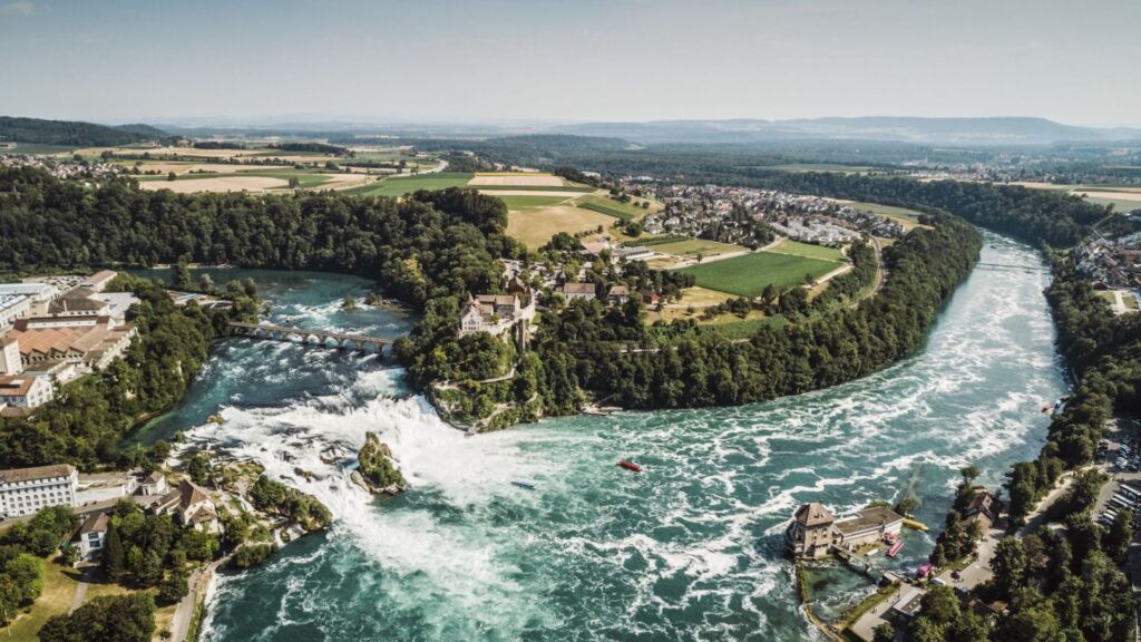 Este conjunto se encuentra en la frontera de Alemania y Suiza las cuales son formadas por el río Rin que se origina en los Alpes Suizos. Las cataratas tienen 23 metros en su punto más alto. Este destino es popular para los turistas porque hay senderos que bordean el río que pueden hacer caminando o en bicicleta, paseo en barco por el cañón y una plataforma donde se puede observar la espectacular caída de las cataratas.